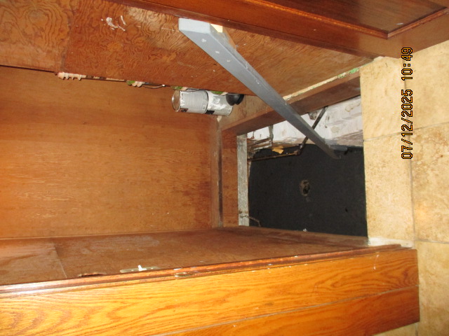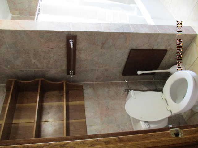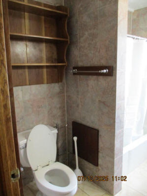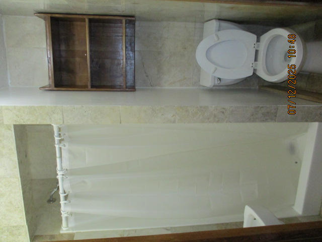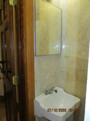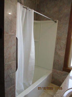 Downstairs Bathroom with Marble walls with Shower, Entry door to basement