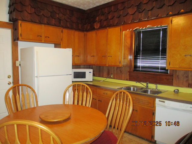 black walnut shelf, tile flooring, ceiling fan, microwave and dishwasher