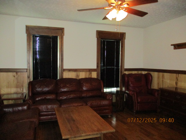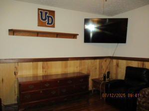 Oak Wood Flooring, Fan, Wall mounted flat screen television, coffee table, End Tables, Simply beautiful with