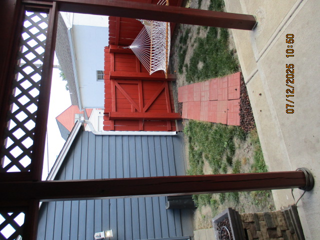 adirondack chair, stone flowerbed, side by side with our home at 25