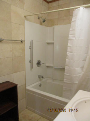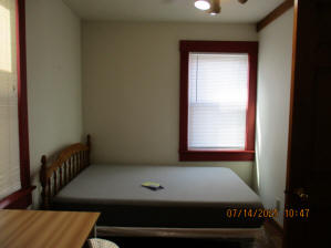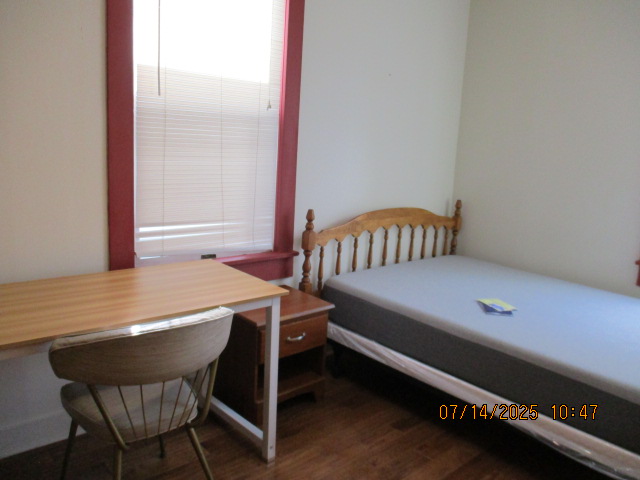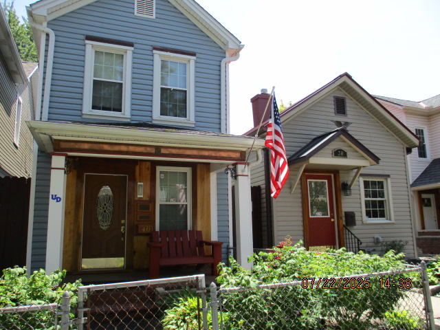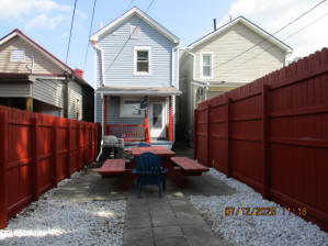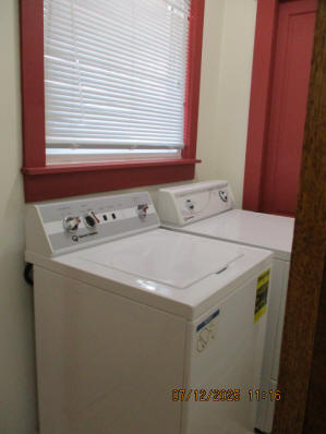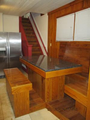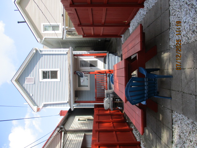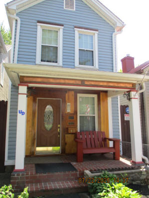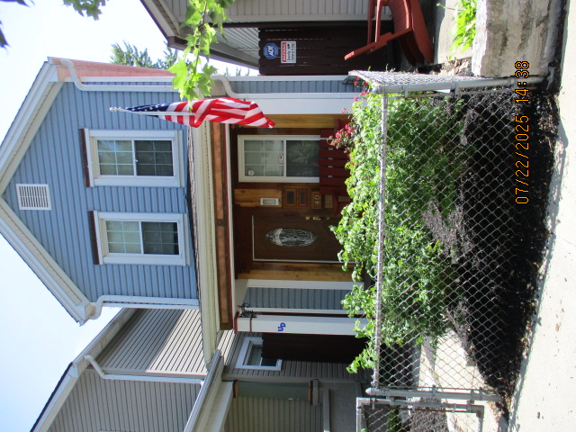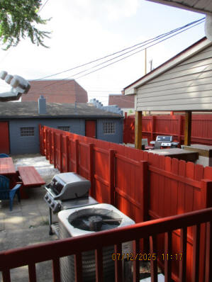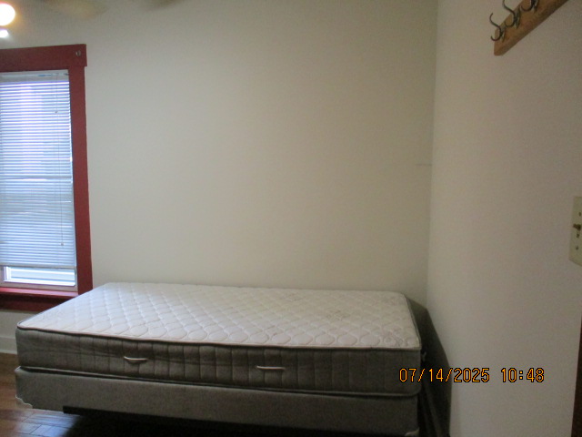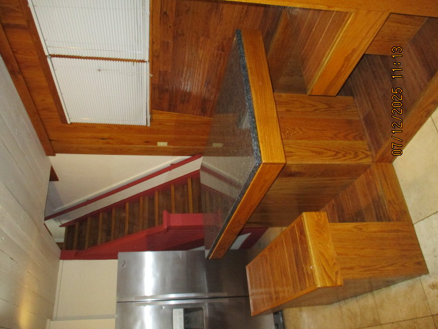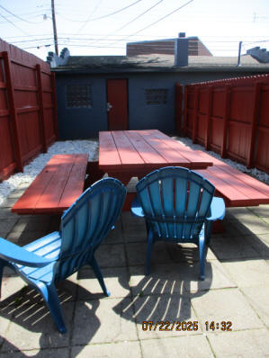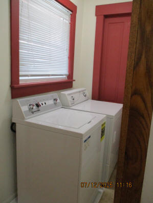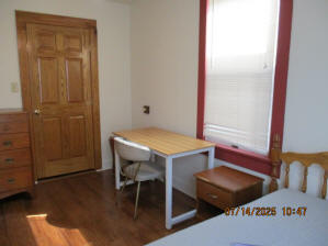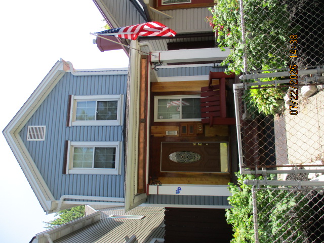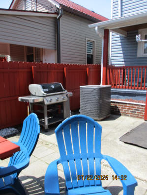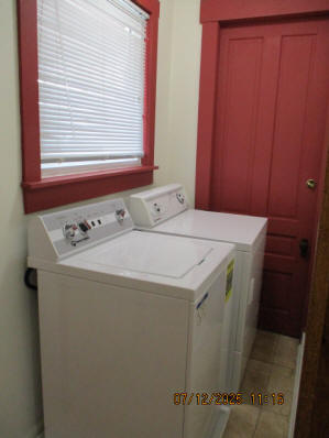 Kitchen with butcher block countertops with farmhouse sink, tile flooring, custom built oak table with blue coral granite top, custom built wood staircase, cherry cabinets. Downstairs bathroom with Italian marble walls, oak vanity and tile flooring, commercial bathtub/shower Washer and dryer area with Speed Queen washer and dryer set, hallway, storage basement off of laundry area Privacy fenced in backyard with back patio area with picnic table, gas grill and gas firepit Upstairs bathroom with Italian marble tile walls, tile flooring, and bathtub/shower, and upstairs hallway and landing. Back upstairs bedroom currently with full bed, desk, dresser, ceiling fan, and cedar lined closet Middle upstairs bedroom currently with twin bed, desk, dressers, ceiling fan and cedar lined closet Front upstairs bedroom currently with two twin beds, desk, dresser, ceiling fan and cedar lined closet This page last updated 07/29/2025