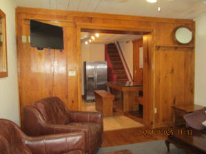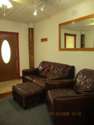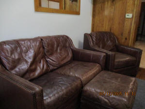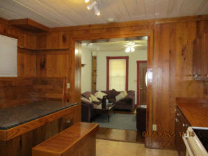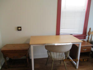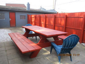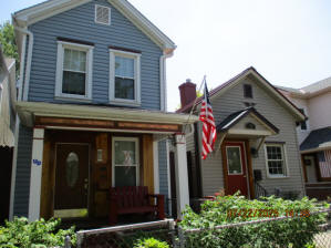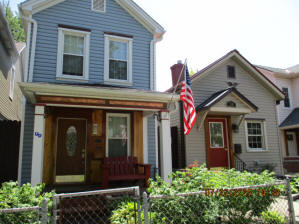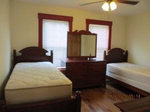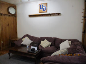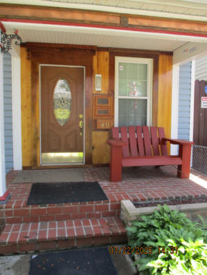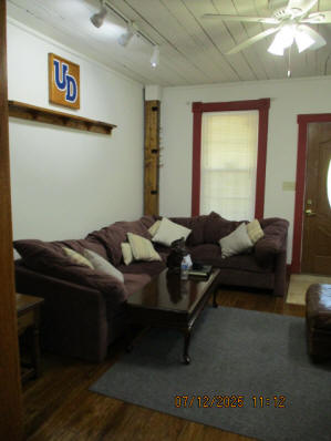 40 Jasper Street Old school hickory wood flooring in living room and upstairs bedrooms; tile flooring in kitchen and bathrooms; kitchen with butcher block countertops and farmhouse sink; kitchen also includes custom built oak kitchen table with blue coral granite top, cherry kitchen cabinets; two bathrooms with Italian marble tile walls, commercial bathtubs, and tile flooring; brick front porch; custom built coffee table; wall mounted television in living room; back patio area with picnic table, gas grill and gas fire pit. This property has the following features: 3 bedrooms, 2 bathrooms with Italian marble tile walls, central air conditioning, premium leather living room set, beautiful wood ceiling with track lighting in living room, washer and dryer, privacy fenced in backyard with back patio area. Best of all, you are half a block from campus and all the fine restaurants!! **As with all our properties, maintenance is included.* (Click on any of the pictures below to see an enlarged views) Front views with brick front porch with new custom oak wall with black walnut accents, custom built adirondack chair, and planter box. Right next to our home at 38 Jasper (tan siding) Living Room with premium sectional sofa, leather love seat, old school hickory wood flooring, wall mounted television, ceiling fan, and wood ceiling with track lighting.