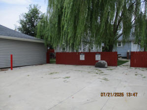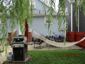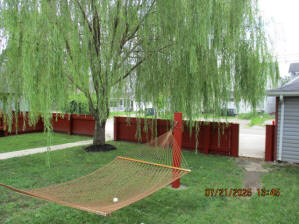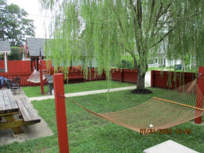 Backyard with security lighting and off street parking with lighting. Privacy fence in backyard, hammock, picnic table, gas grill, and custom bench in fence, next door and open backyard with our home at 42 Frank This page last updated 08/05/25 |