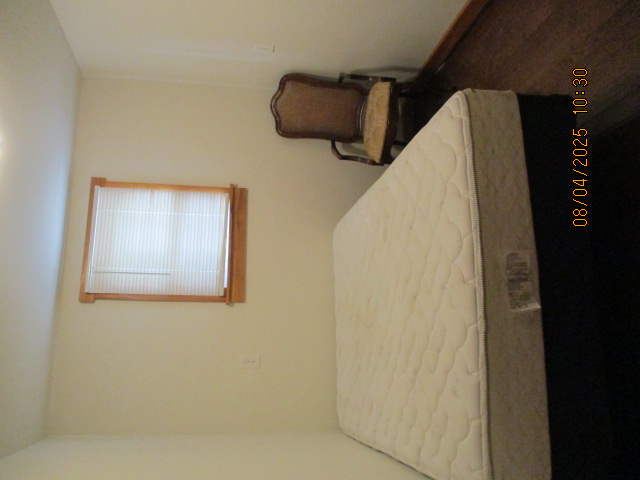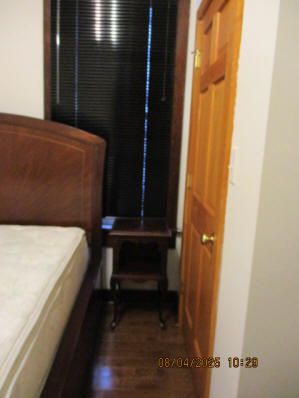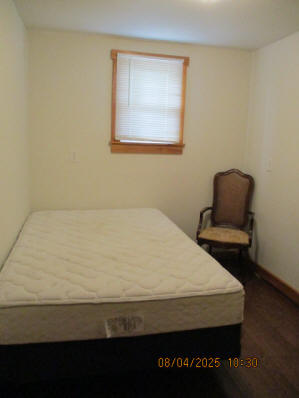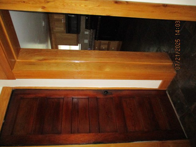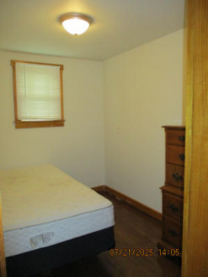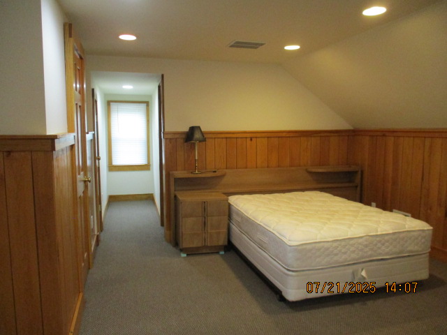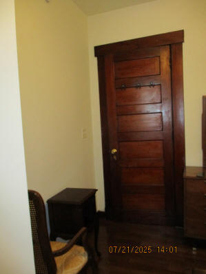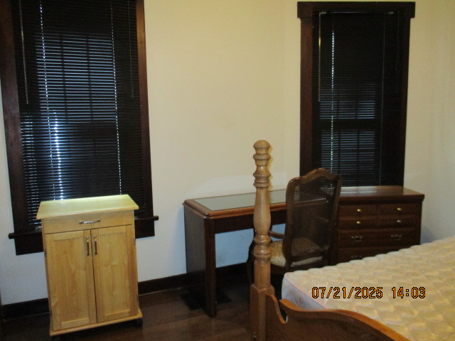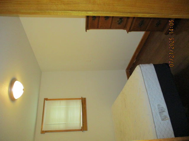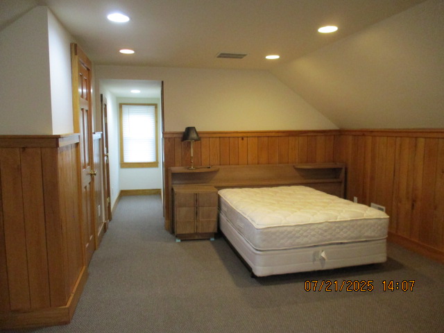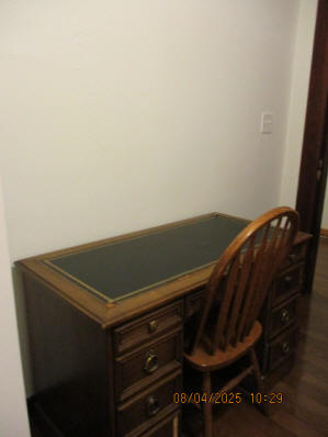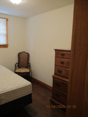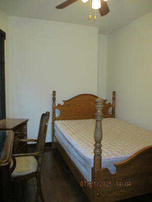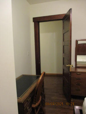 Middle downstairs bedroom with solid oak wood flooring, cedar lined closet, ceiling fan, and currently with queen bed Downstairs study area and hallway leading to bathroom, upstairs loft area, and basement entrance, study room currently with full bed, desk, and dresser