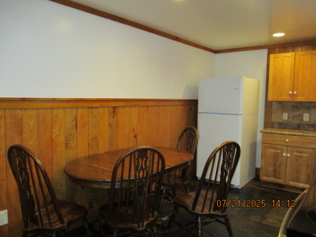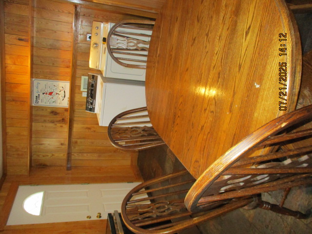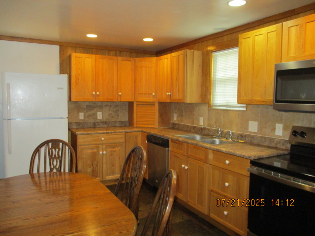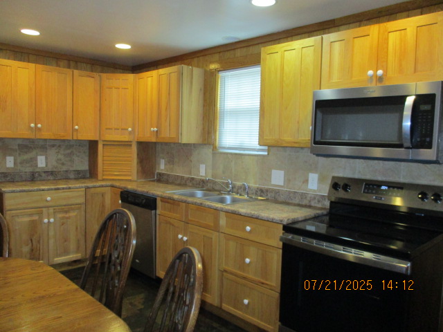 Kitchen with hickory cabinets, oak wainscoting, microwave, dishwasher, premium commercial grade washer and dryer, steel back entry door, and slate tile flooring.