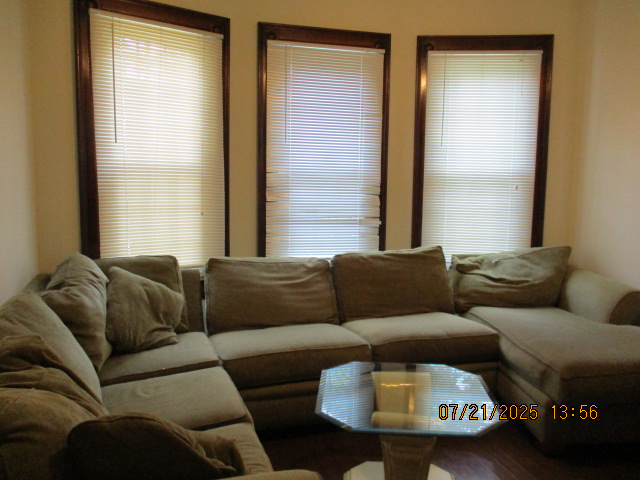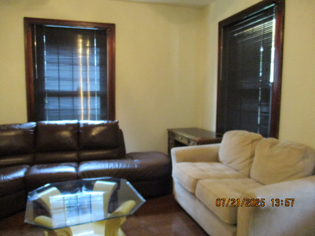 Living Room with solid oak wood flooring, ceiling fan, leather sectional sofa, and steel front entrance door with black walnut trim, hallway leading to downstairs bedrooms. Front downstairs bedroom with solid oak wood flooring, cedar lined closet, currently with queen wood bed, desk, dresser, and ceiling fan.