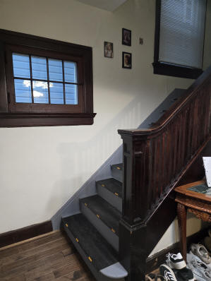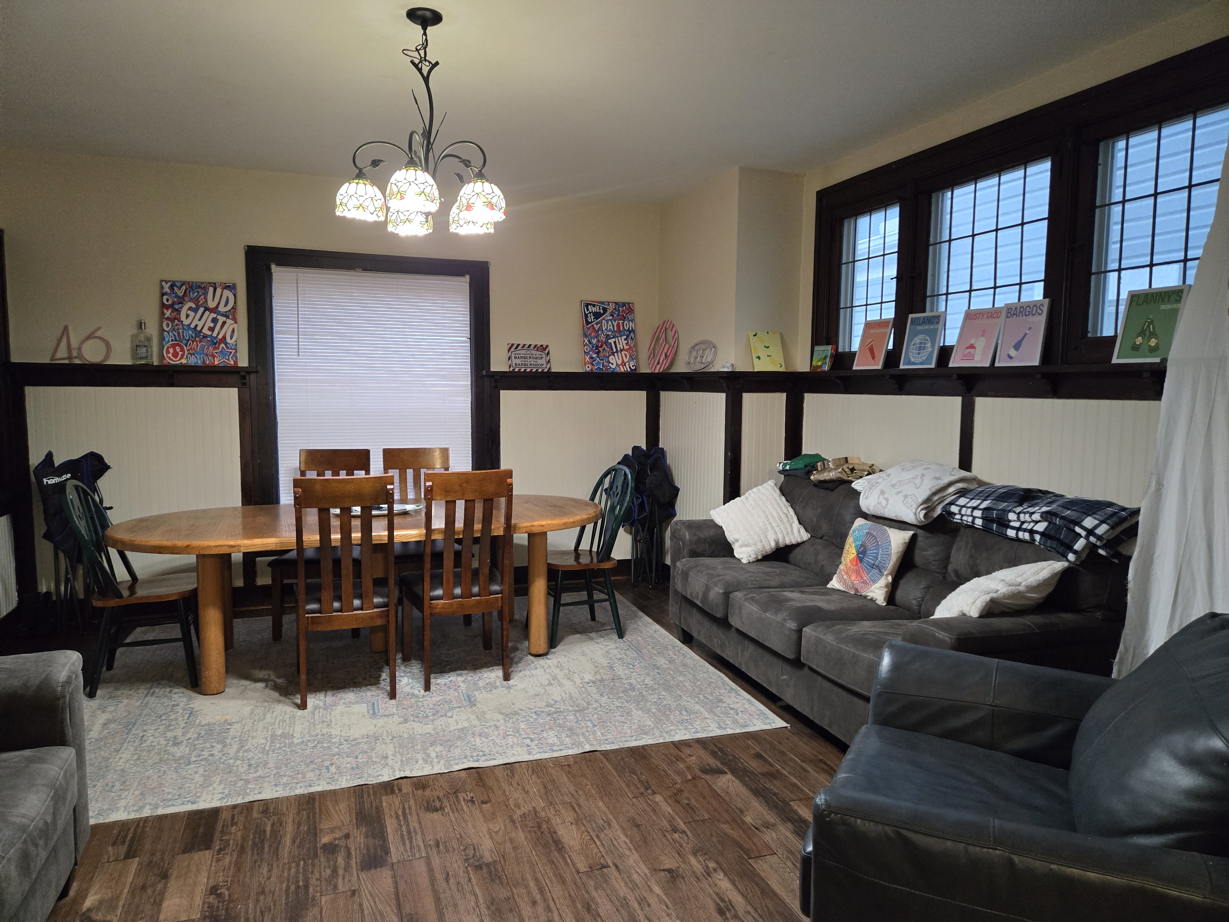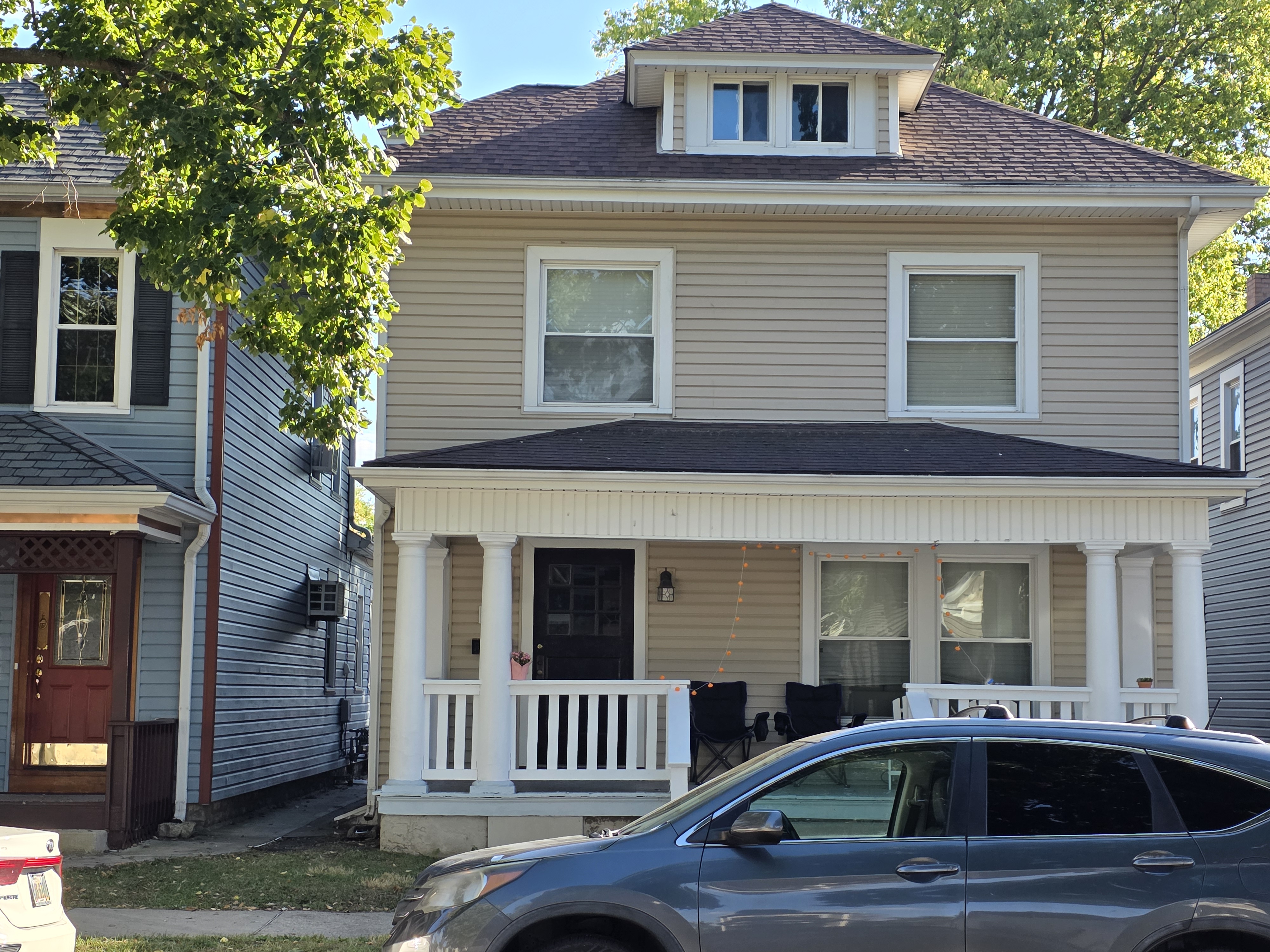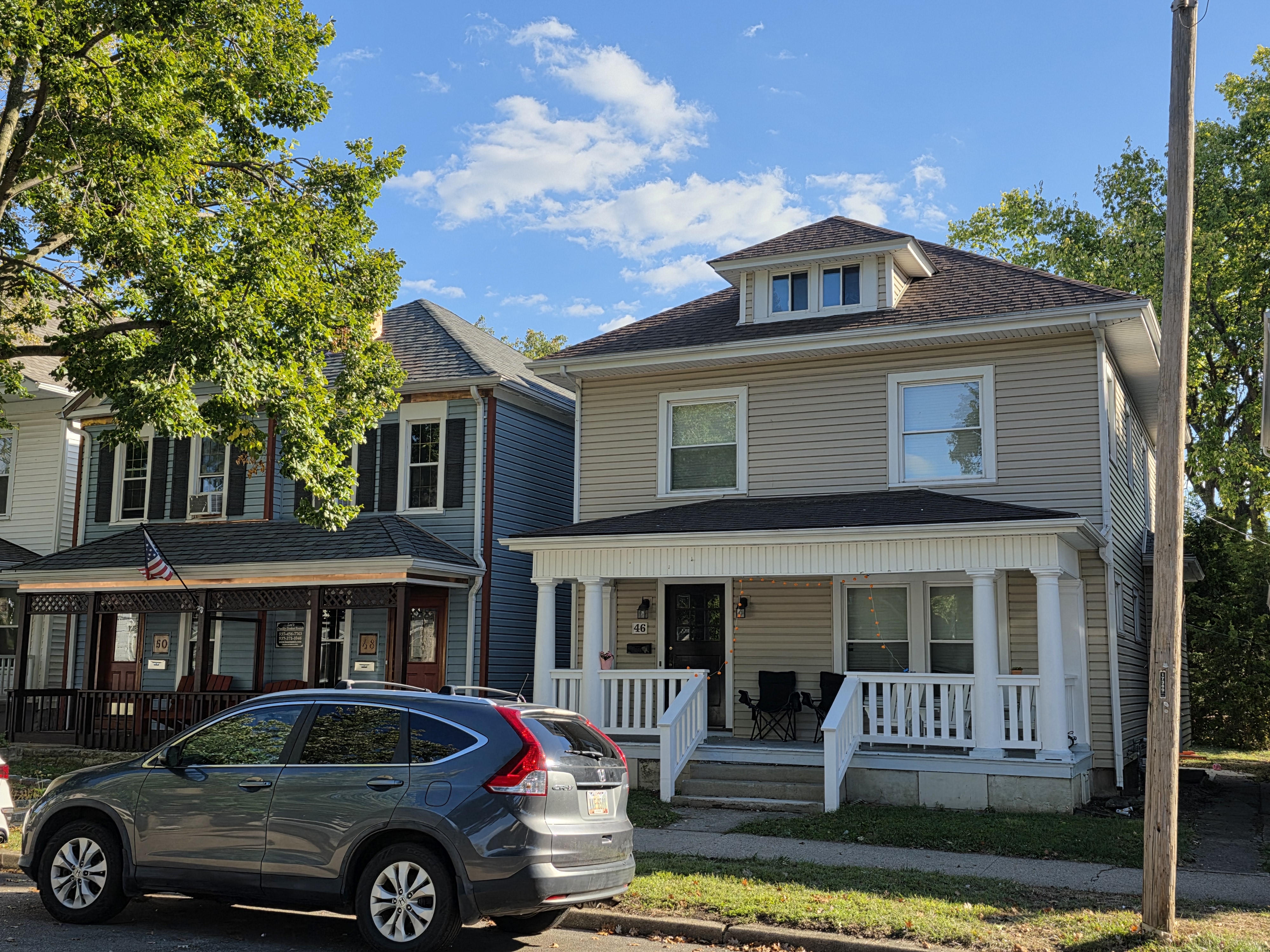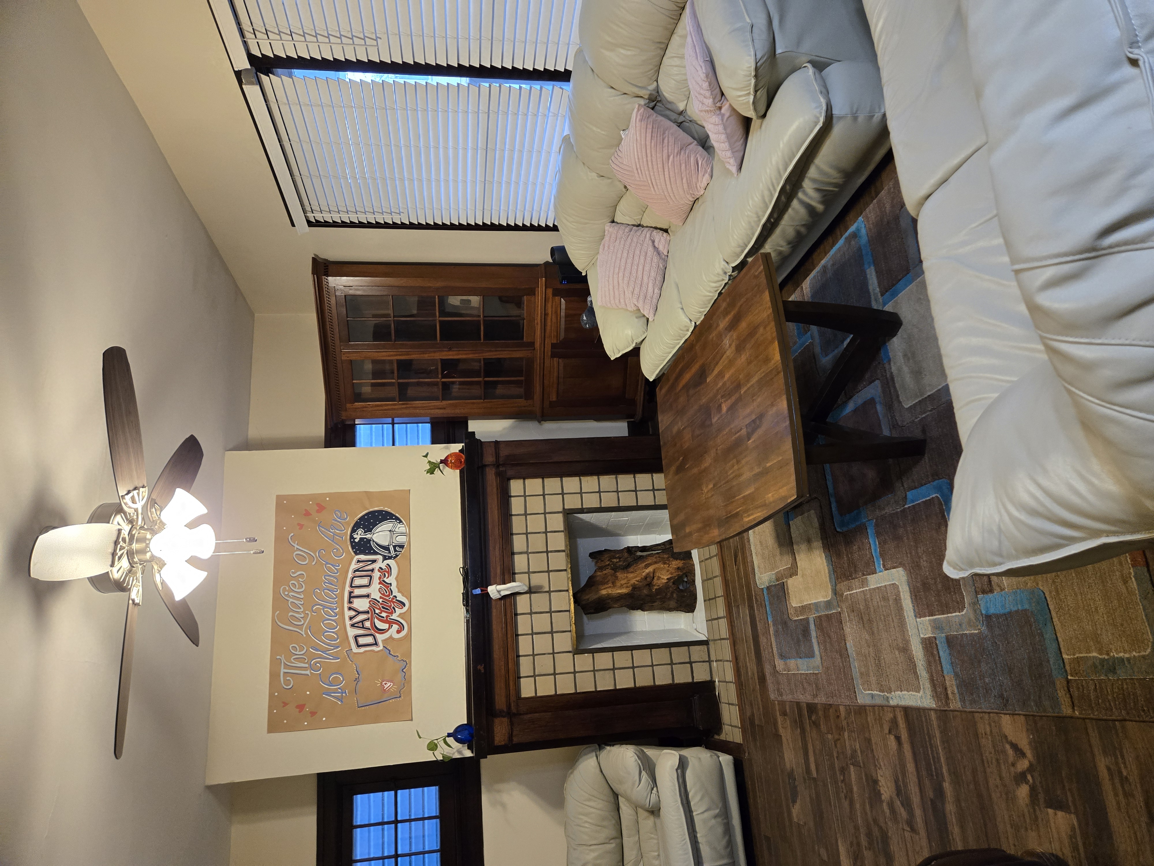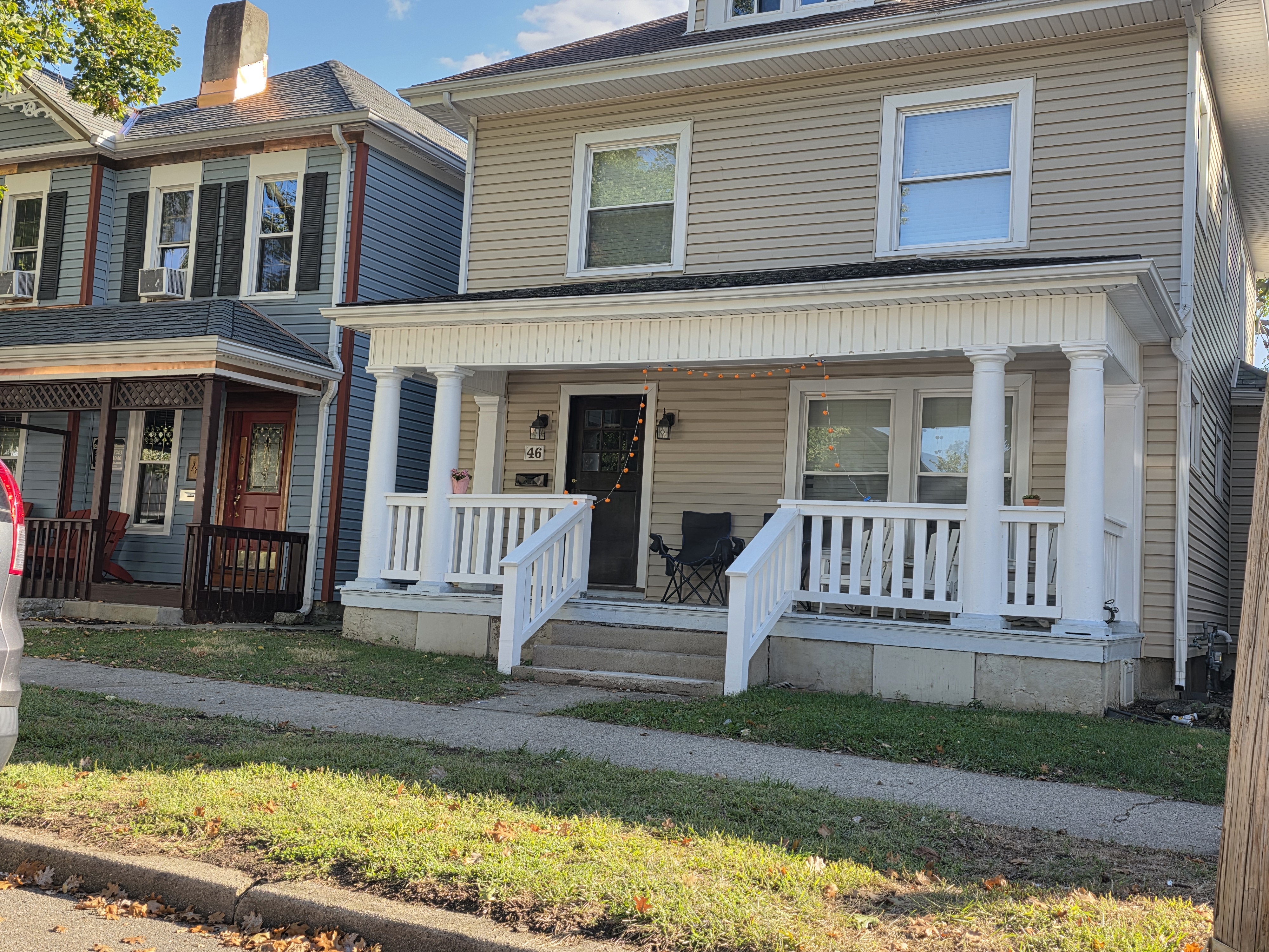 46 Woodland Avenue - right next door to our Tiki house at 48 and 50 Woodland Avenue This property has the following features: 3 large bedrooms, licensed to six students, one and half bathrooms, upstairs laundry, large living room and dining room, beautiful original wood front entry door and wood staircase, central heat and air conditioning, will be fully furnished, will have a nice new concrete pad in backyard, picnic table, new grill, hammock, beatiful stones in backyard this summer. Best of all, you are half a block from campus and all the fine restaurants!! As with all our properties, maintenance is included. (Click on any of the below pictures to see an enlarged view) New updated pictures at the beginning of each room section. Recent updates over winter break: new toilets, new dishwasher, new hardwood hickory flooring installed down stairs, new stair treads for upstairs staircases and basement staircase, new picnic table, hammock, adirondack chair added in backyard, new lighting in kitchen, living and dining rooms; large multi room basement cleaned out, painted and dry locked, new glass block windows and furniture, a great space to hang out in! More front and current back yard views (back yard to have poured concrete pad in backyard, new grill, hammock, picnic table, large stones added this summer Good size living room with faux fireplace, beautiful wood staircase and original wood front entry door Good size kitchen with dishwasher, microwave, built in storage cabinet, new lighting, new dishwasher Storage room off of kitchen by back entrance, cleaned out and painted Downstairs half bathroom off of kitchen, repainted and new toilet LLLarge dining room, new hardwood hickory flooring new lighting Large living room with faux fireplace, beautiful original wood front entry door, beautiful wood staircase, new hardwood hickory flooring, new stair treads, new cabinet, custom UD sign, new lighting Newly cleaned out basement with plenty of space to gather, with new glass block windows, tabe and chairs, stair treads Current backyard, with hammock, picnic table, and adirondack chair, parking pad, (to be updated spring 2026 with poured concrete backyard space) Large upstairs bathroom with big shower, shelving unit, new toilet, new glass showe doors Upstairs laundry Triple bedroom with three closet spaces Double bedroom with two closet spaces Single bedroom, good size closet space Unfinished attic bonus space This page last updated 1/23/2026