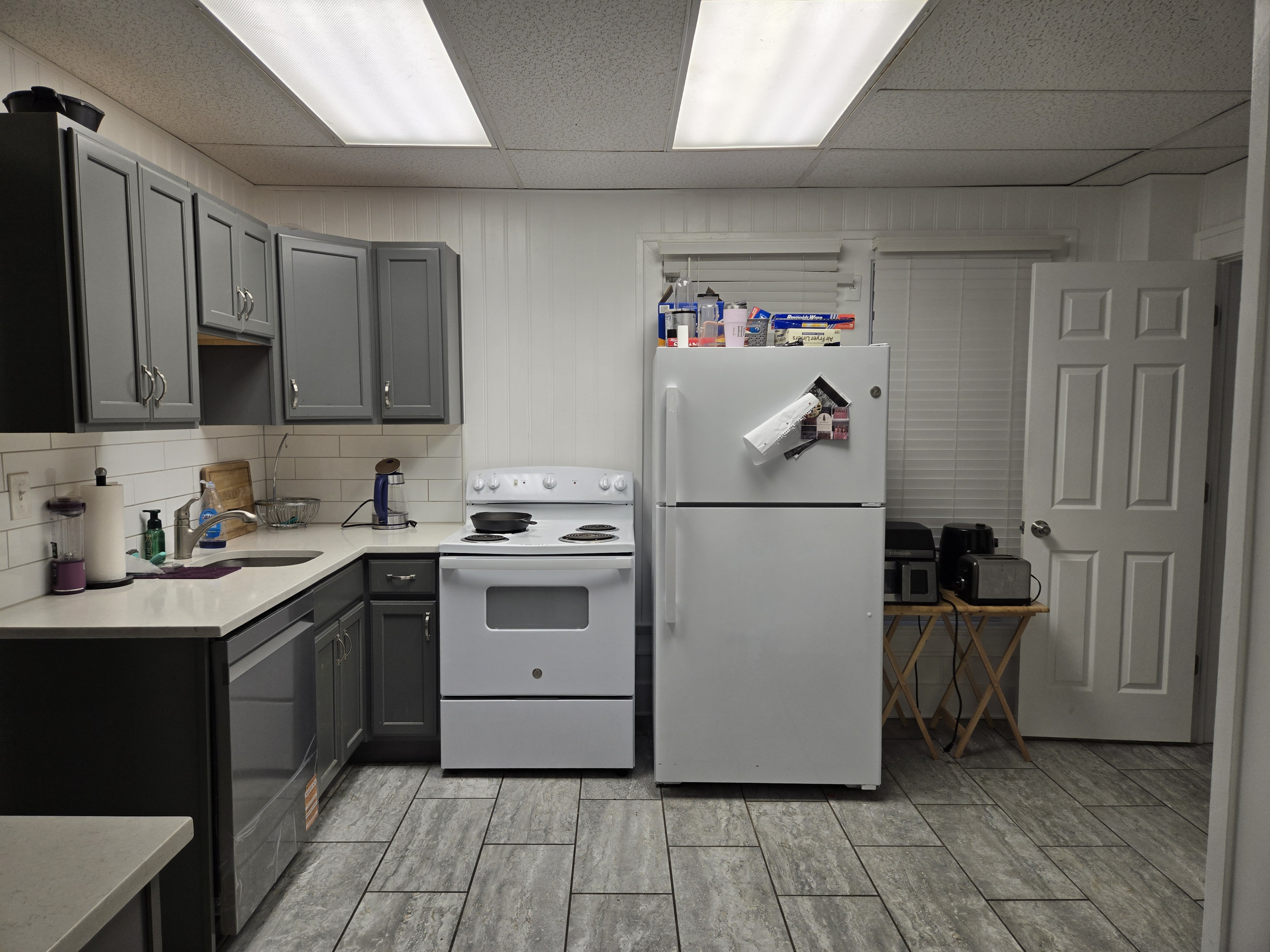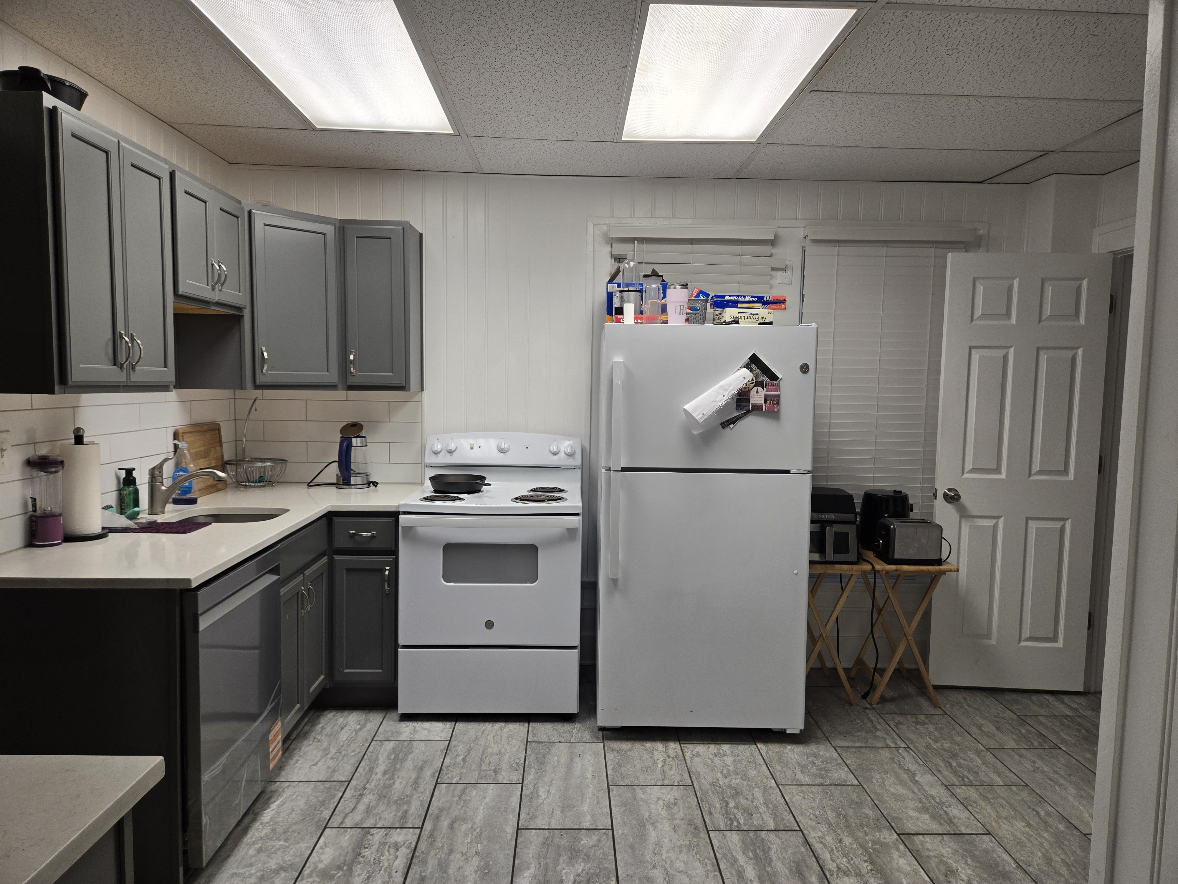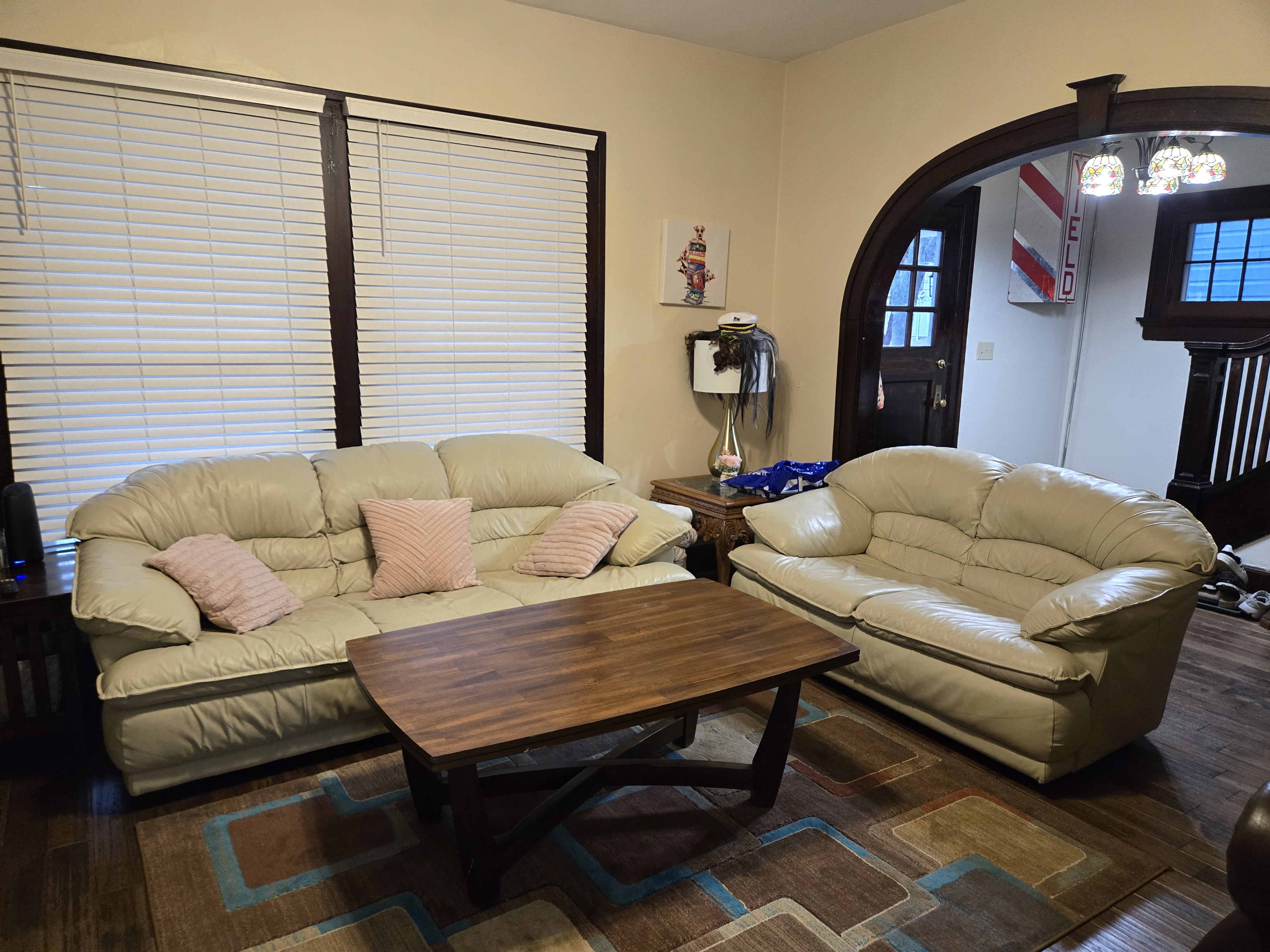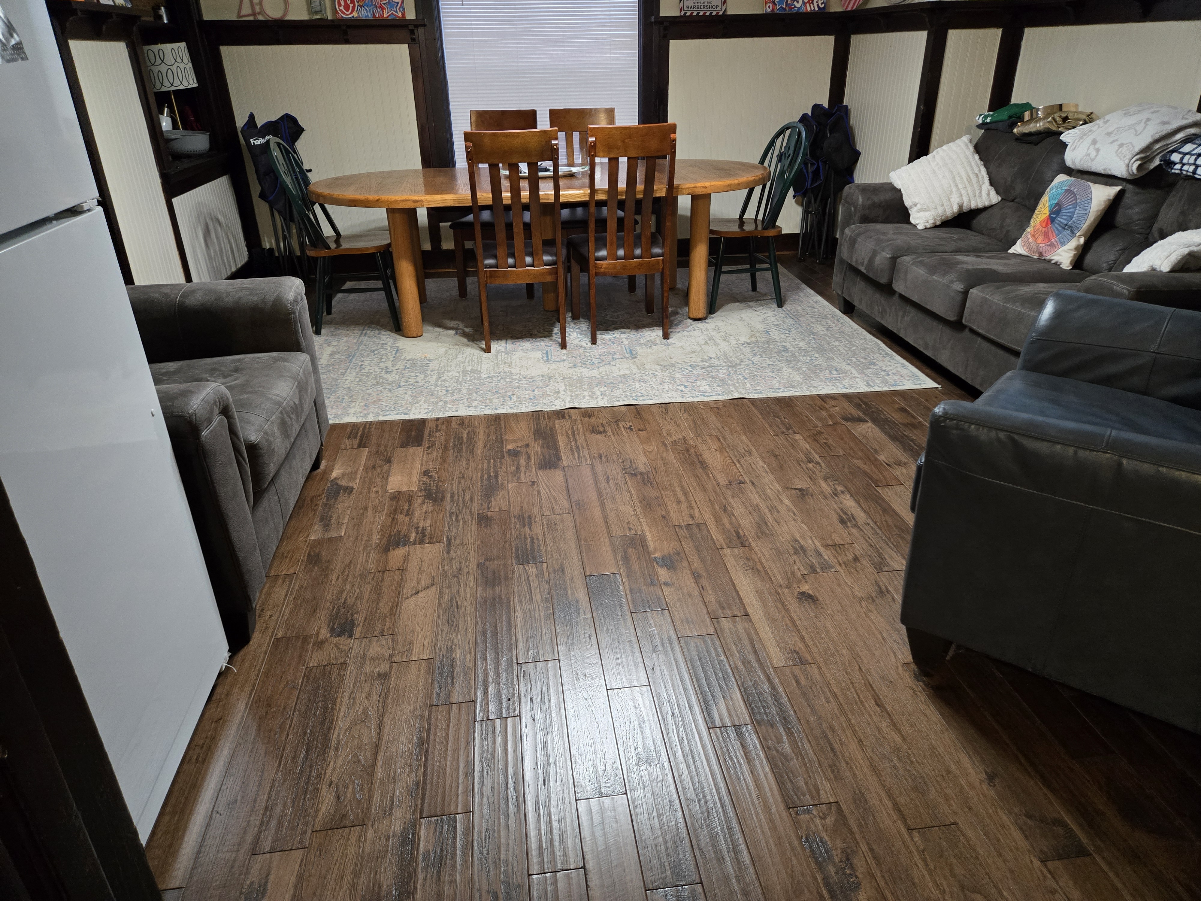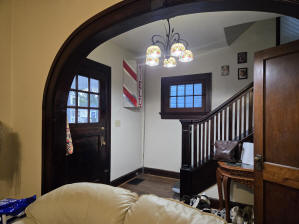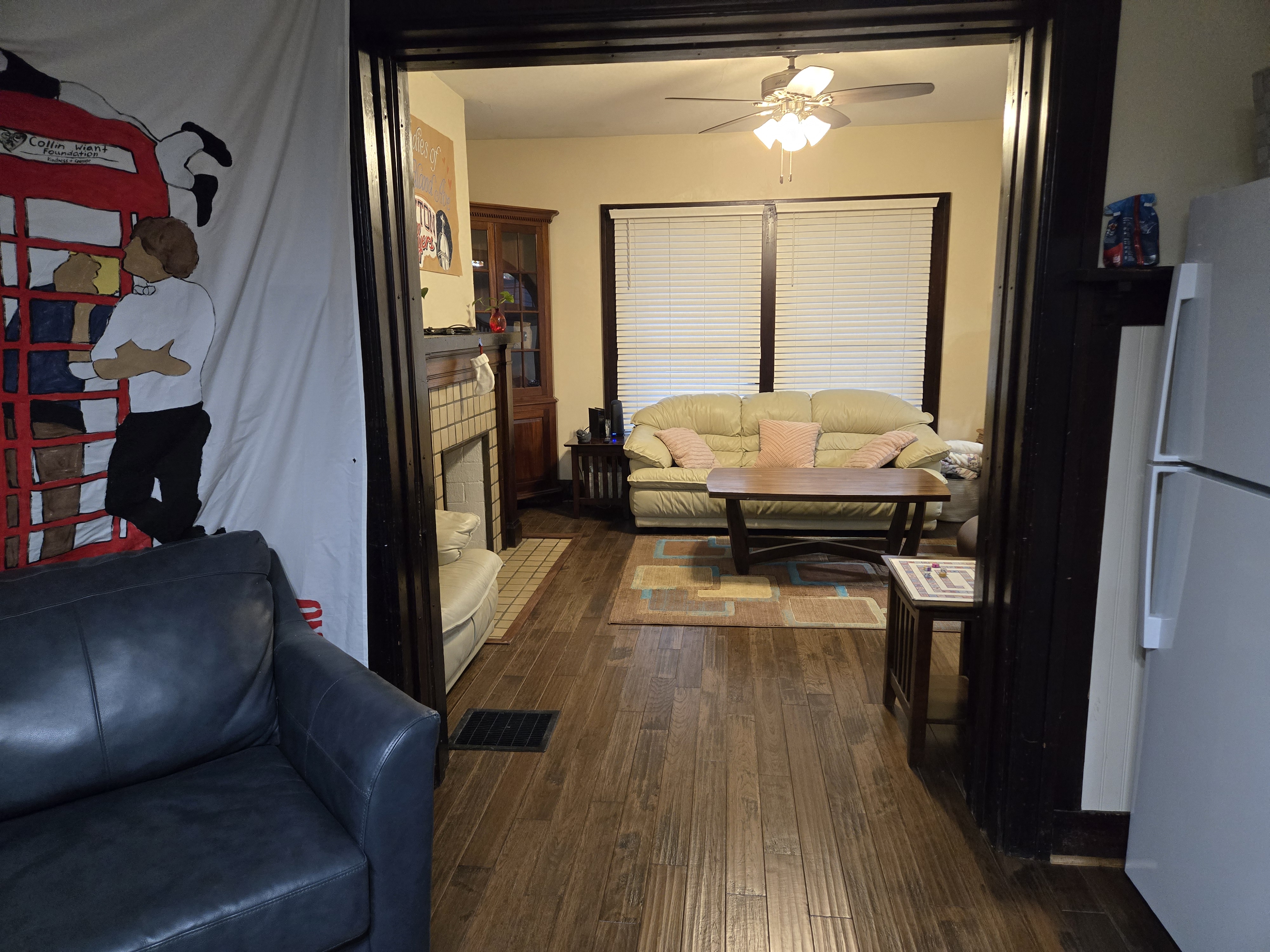 46 Woodland Avenue - right next door to our Tiki house at 48 and 50 Woodland Avenue This property has the following features: 3 large bedrooms, licensed to six students, one and half bathrooms, upstairs laundry, large living room and dining room, beautiful original wood front entry door and wood staircase, central heat and air conditioning, will be fully furnished, will have a nice new concrete pad in backyard, picnic table, new grill, hammock, beatiful stones in backyard this summer. Best of all, you are half a block from campus and all the fine restaurants!! As with all our properties, maintenance is included. (Click on any of the below pictures to see an enlarged view) New updated pictures at the beginning of each room section. Recent updates over winter break: new toilets, new dishwasher, new hardwood hickory flooring installed down stairs, new stair treads for upstairs staircases and basement staircase, new picnic table, hammock, adirondack chair added in backyard, new lighting in kitchen, living and dining rooms; large multi room basement cleaned out, painted and dry locked, new glass block windows and furniture, a great space to hang out in! More front and current back yard views (back yard to have poured concrete pad in backyard, new grill, hammock, picnic table, large stones added this summer Good size living room with faux fireplace, beautiful wood staircase and original wood front entry door Good size kitchen with dishwasher, microwave, built in storage cabinet, new lighting, new dishwasher Storage room off of kitchen by back entrance, cleaned out and painted Downstairs half bathroom off of kitchen, repainted and new toilet LLLarge dining room, new hardwood hickory flooring new lighting Large living room with faux fireplace, beautiful original wood front entry door, beautiful wood staircase, new hardwood hickory flooring, new stair treads, new cabinet, custom UD sign, new lighting Newly cleaned out basement with plenty of space to gather, with new glass block windows, tabe and chairs, stair treads Current backyard, with hammock, picnic table, and adirondack chair, parking pad, (to be updated spring 2026 with poured concrete backyard space) Large upstairs bathroom with big shower, shelving unit, new toilet, new glass showe doors Upstairs laundry Triple bedroom with three closet spaces Double bedroom with two closet spaces Single bedroom, good size closet space Unfinished attic bonus space This page last updated 1/23/2026